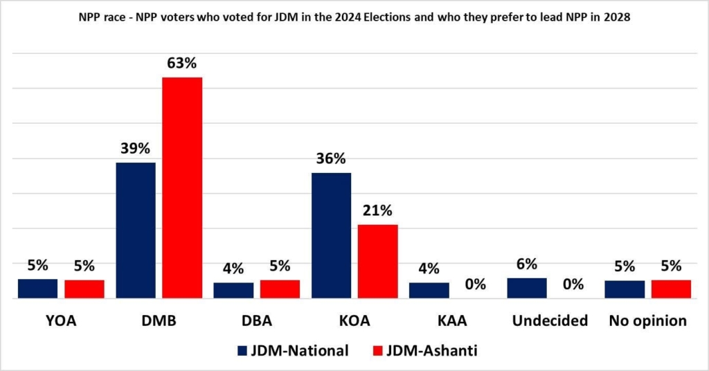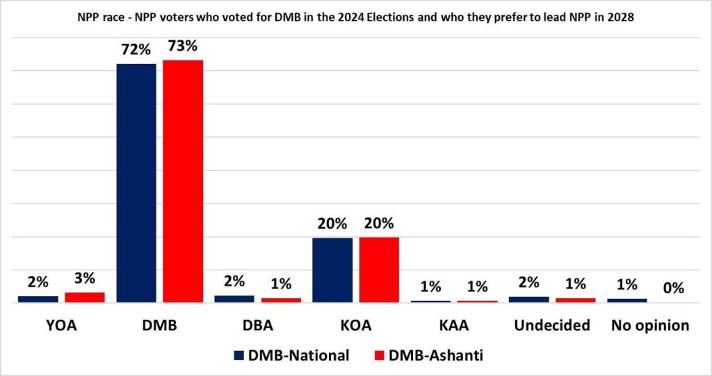 Nationally, 72 per cent of NPP voters who supported Dr Bawumia in the 2024 elections say they still stand firmly behind him to lead the party, compared to 20 per cent for Dr Kwabena Agyei Agyepong (KOA).