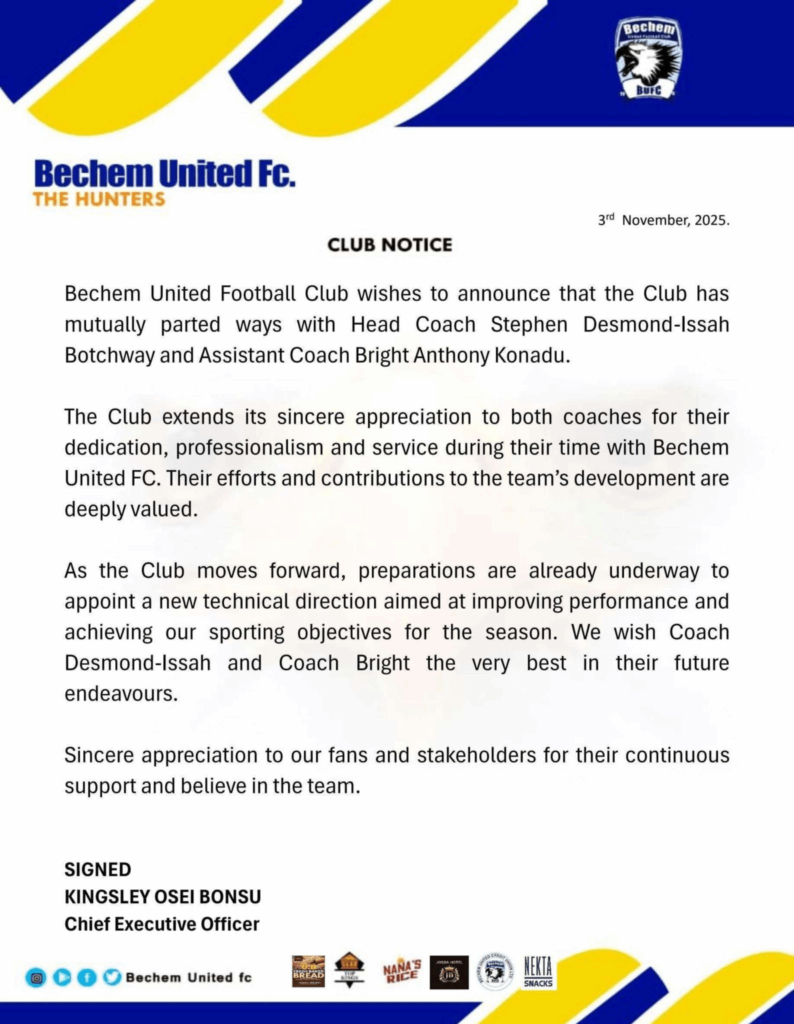 Bechem United have parted ways with head coach Desmond Issah-Botchway following a difficult start to the 2025/26 Ghana Premier League season.