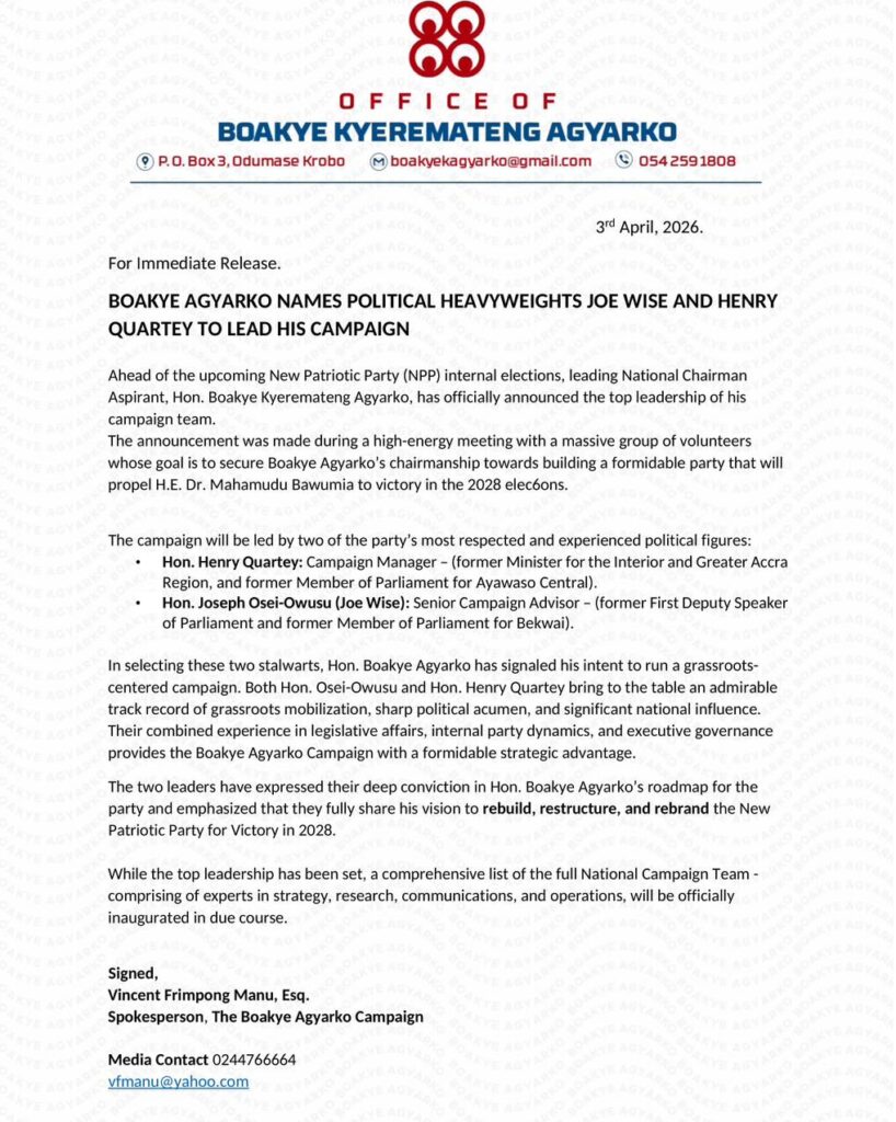 In a strategic move, Boakye Agyarko has appointed former Ayawaso Central MP Hon. Henry Quartey as his Campaign Manager and former First Deputy Speaker of Parliament, Hon. Joseph Osei-Owusu (popularly known as Joe Wise), as Senior Campaign Advisor.