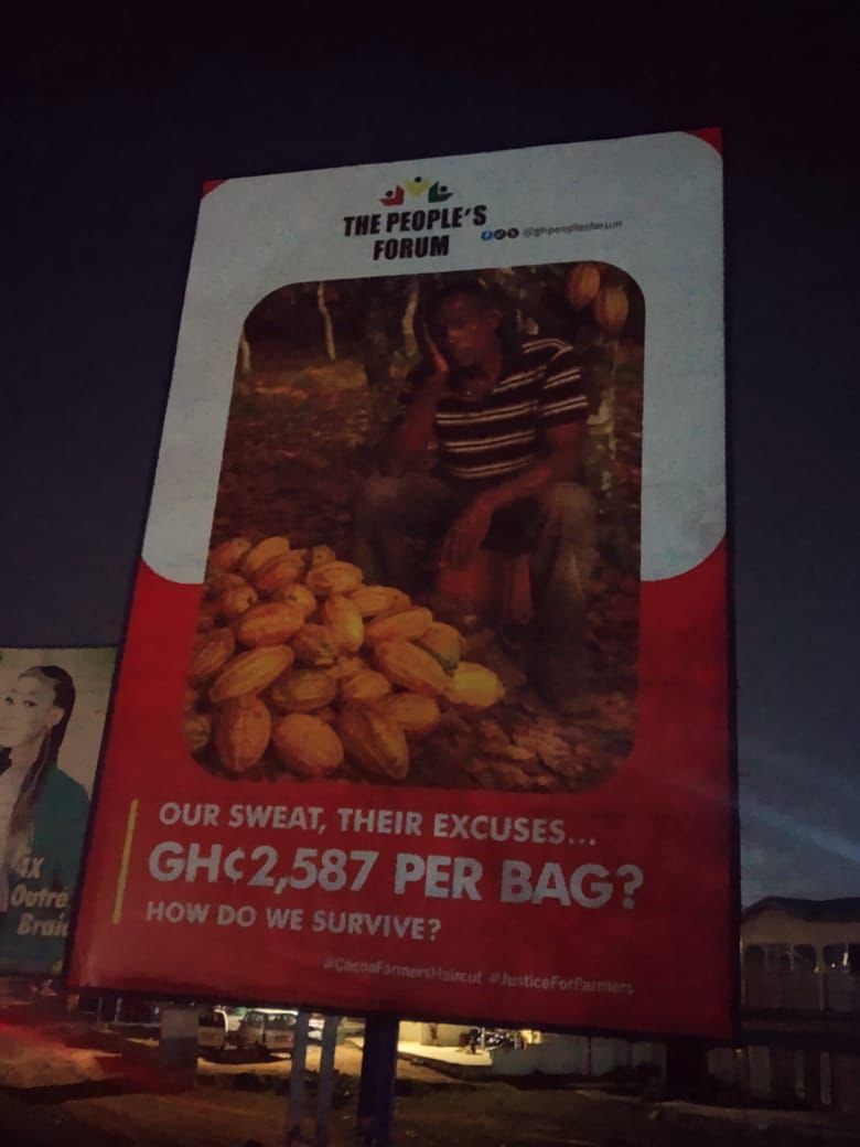 In a bold and visually striking display of public advocacy, The People’s Forum has erected large billboards across Ghana’s capital and key areas, amplifying the growing outrage among cocoa farmers following the government’s mid season reduction of the farmgate price to GH¢2,587 per 64kg bag.