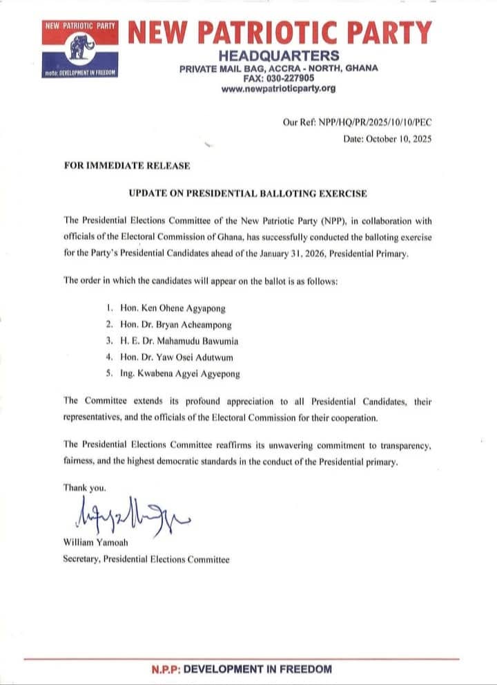 In a statement released on October 10, 2025, William Yamoh, Secretary of the Presidential Elections Committee, confirmed the outcome. The candidates will appear on the ballot in the following order: Hon. Ken Ohene Agyapong, Hon. Dr. Bryan Acheampong, H.E. Dr. Mahamudu Bawumia, Hon. Dr. Yaw Osei Adutwum, and Ing. Kwabena Agyei Agyepong. The draw, overseen with transparency, sets the stage for the upcoming primary contest.