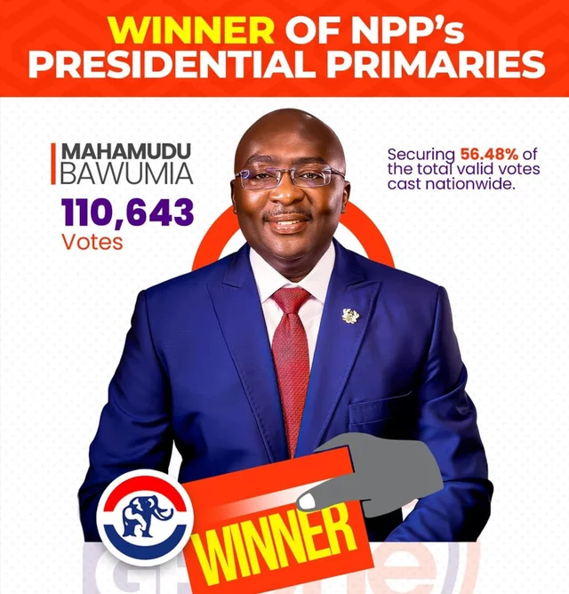 H.E. Dr. Mahamudu Bawumia has been declared the winner of the New Patriotic Party’s (NPP) presidential primaries after securing 56.48 percent of the total valid votes cast across the country.