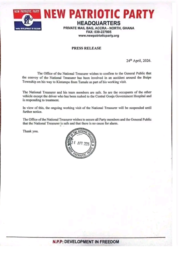 The Office of the National Treasurer of the New Patriotic Party (NPP), Dr. Charles Dwamena, has announced the suspension of his ongoing working visit following a road accident in the Savannah Region.