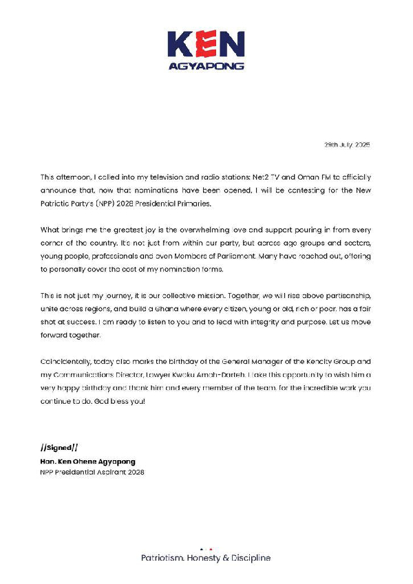In a statement released on July 29, 2025, Kennedy Agyapong said he made the announcement by calling into his media platforms, Oman FM and Net2 TV, to confirm his decision to run.