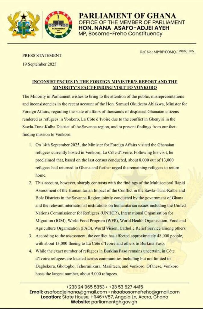 ACCRA – The Minority in Parliament has raised serious concerns over what it calls misrepresentations and inconsistencies in the recent report by the Minister for Foreign Affairs, Hon. Samuel Okudzeto Ablakwa, regarding Ghanaian refugees in Vonkoro, Côte d’Ivoire.