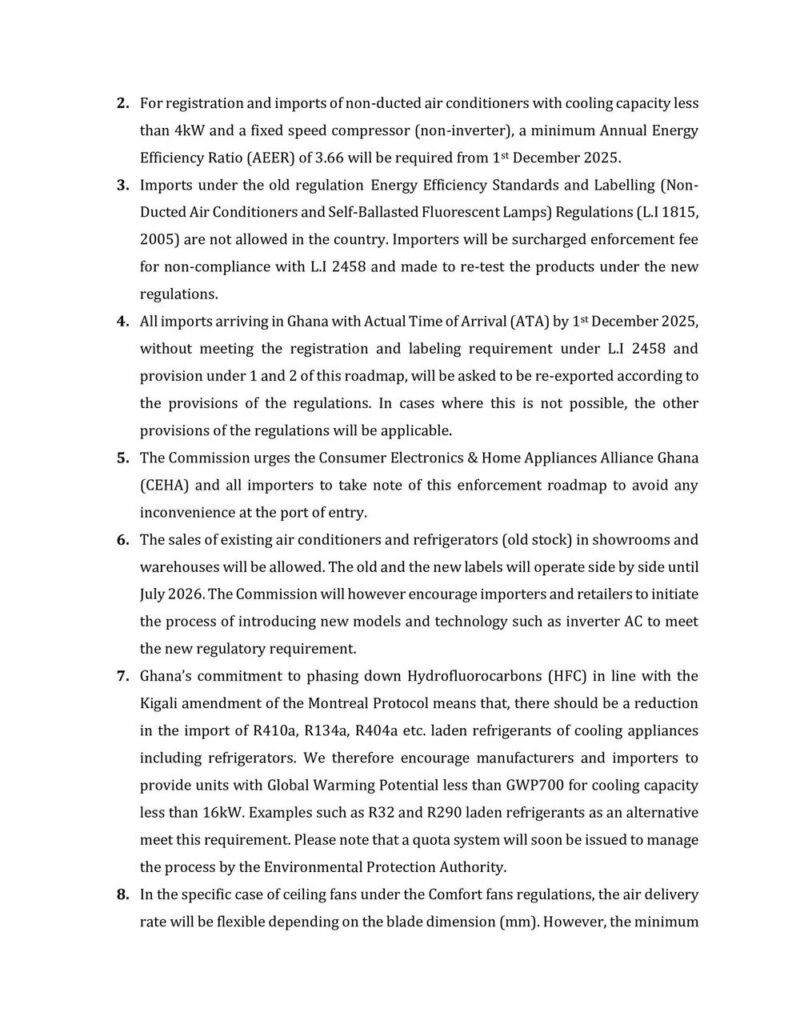 The measures stem from 19 Legislative Instruments (L.I.) passed by Parliament in 2022 to regulate the appliance market, reduce electricity waste, and protect consumers from high energy bills.