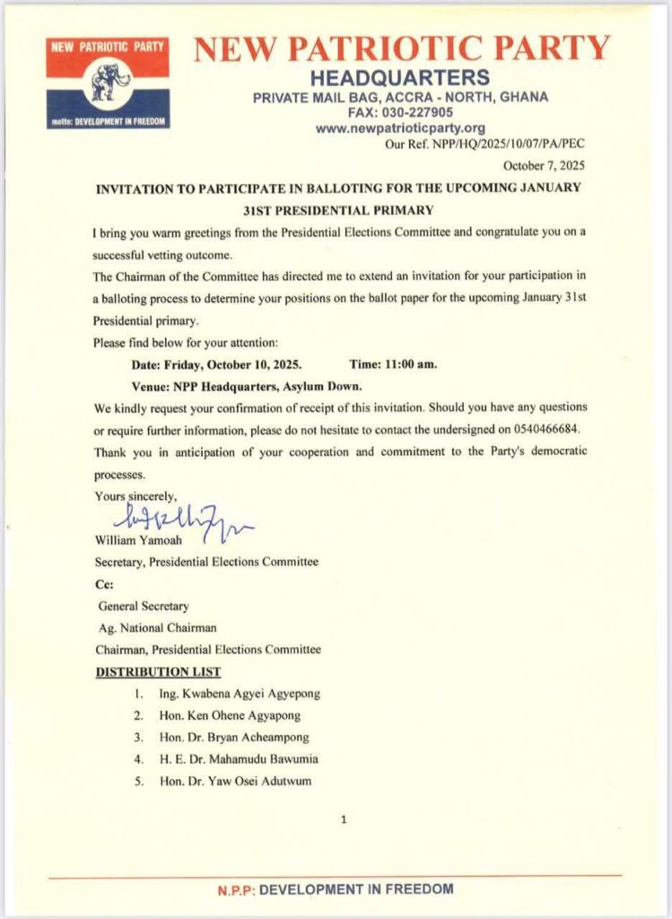 In a press statement/release dated October 7, 2025, William Yamoh, Secretary of the Presidential Elections Committee, invited the five vetted aspirants to participate. The list includes Ing. Kwabena Agyei Agyepong, Hon. Ken Ohene Agyapong, Hon. Dr. Bryan Acheampong, H.E. Dr. Mahamudu Bawumia, and Hon. Dr. Yaw Osei Adutwum. The NPP congratulated the candidates on their successful vetting and urged confirmation of receipt by contacting the Secretary of the Presidential Elections Committee.