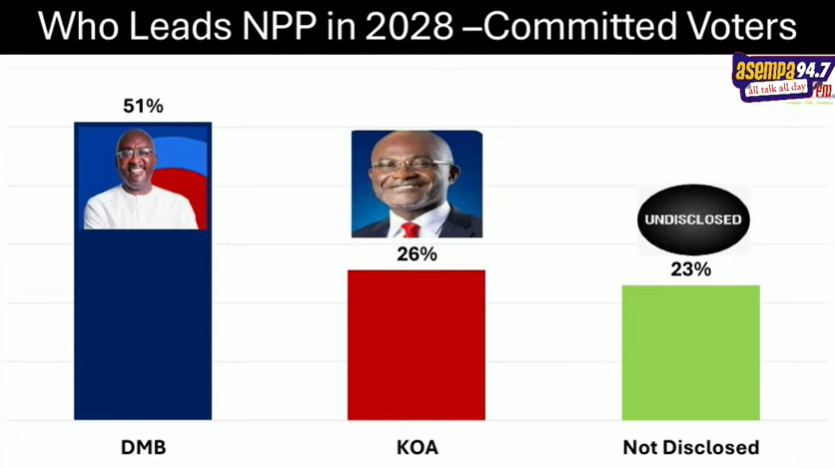 According to data presented by Global InfoAnalytics among committed voters, Dr Bawumia leads the race with 51 per cent support, followed by Kennedy Agyapong with 26 per cent, while 23 per cent of respondents remain undecided.