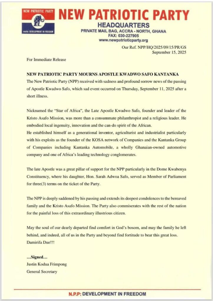 In a heartfelt statement, the party described Apostle Safo as a symbol of African ingenuity and resilience. His pioneering work in technology, agriculture, and automobile manufacturing especially through the Kantanka Group of Companies was celebrated as a testament to what local innovation can achieve when fueled by faith and determination.