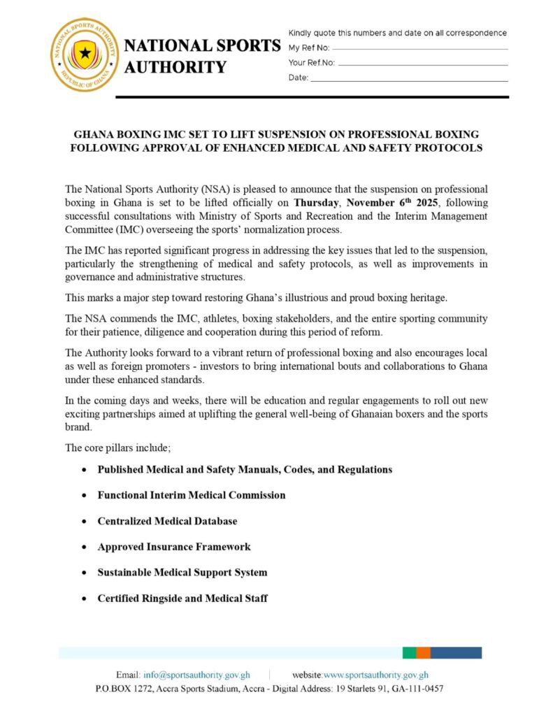 The National Sports Authority (NSA) has officially lifted the suspension on professional boxing in Ghana, effective Thursday, November 6, 2025.