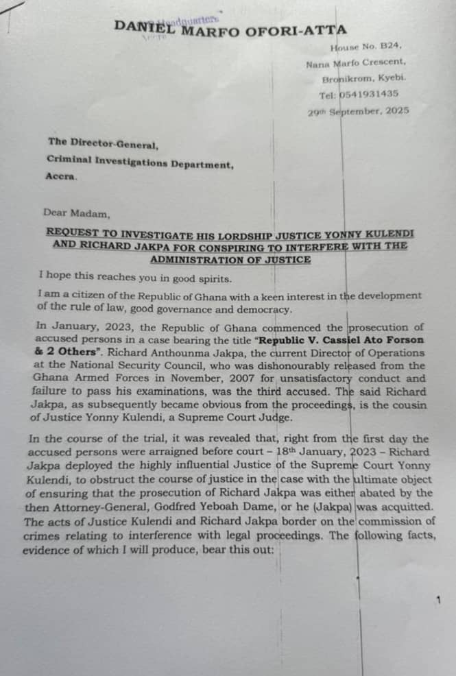 ACCRA – A Ghanaian citizen, Daniel Marfo Ofori-Atta, has formally petitioned the Criminal Investigations Department (CID) to investigate Supreme Court Justice Yonny Kulendi and businessman Richard Jakpa for allegedly conspiring to influence legal proceedings in the high-profile case of Republic v. Cassiel Ato Forson & 2 Others.