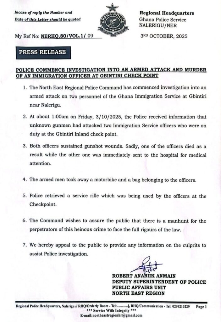 According to a press release issued by the Regional Police Headquarters in Nalerigu on Friday, October 3, 2025, the officers were attacked by unknown gunmen around 1:00 a.m. while on duty.