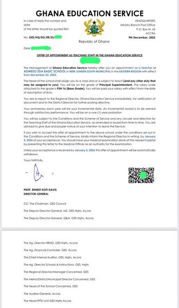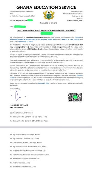 Speaking on Adom FM’s morning show, Dwaso Nsem, organizer for the Coalition for Unemployed Trained Teachers, Paul Octhere Karikari, revealed that although no official communication has been issued by GES, some teachers have begun receiving appointment letters, some dated as far back as December 9, 2025, December 10, 2025, and December 11, 2025.