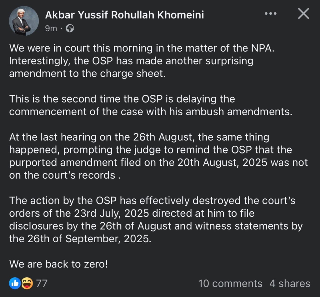 Khomeini said that similar amendments had been filed during the last hearing on August 26, 2025, despite a court order directing the OSP to file disclosures by August 26 and witness statements by September 26, 2025.